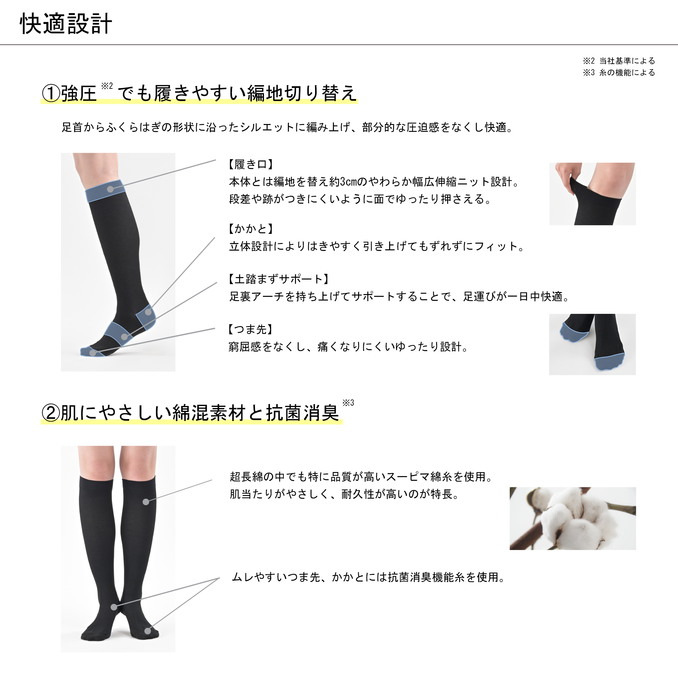 肌当たりが優しい上質なコットン糸で編み上げた強圧設計*²で美と健康をサポート。